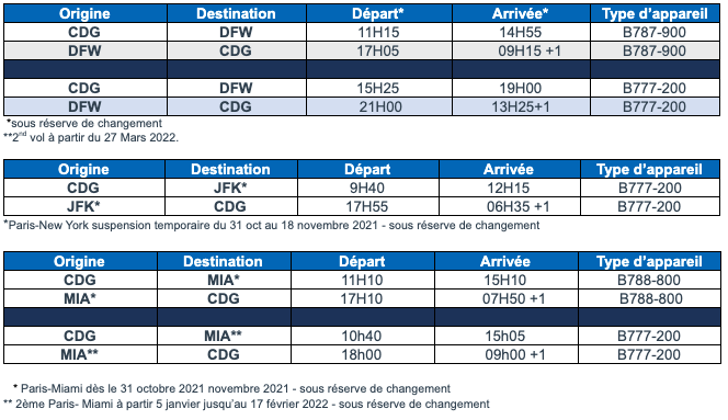 Depuis mars 2021, Les liaisons entre Paris (CDG) et Dallas Fort/Worth (DFW) et Paris – New York (JFK) sont quotidiennes. American étoffe son offre en ajoutant un deuxième vol vers Dallas/Fort Worth pour la saison été 2022 et dès le 31 octobre 2021, American reprendra son vol entre Paris (CDG) et Miami (MIA). Un second vol vers Miami sera ajouté du 5 janvier au 17 février 2022.